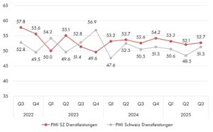 Während die Industrieunternehmen die veränderten wirtschaftlichen Rahmenbedingungen zu spüren bekommen, verzeichnen Dienstleister weiteres Wachstum. Hauptverantwortlich für die unterschiedliche Entwicklung dürften die per 1. August eingeführten US-Zölle im Umfang von 39 % sein.